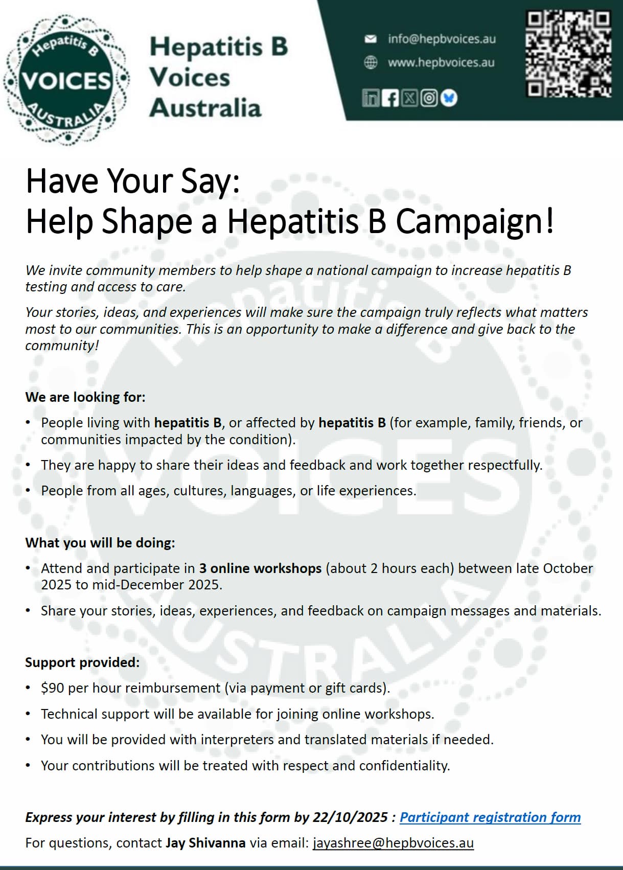 Hepatitis B Voices Australia is looking for people living with or affected by hepatitis B to help shape a new national campaign.