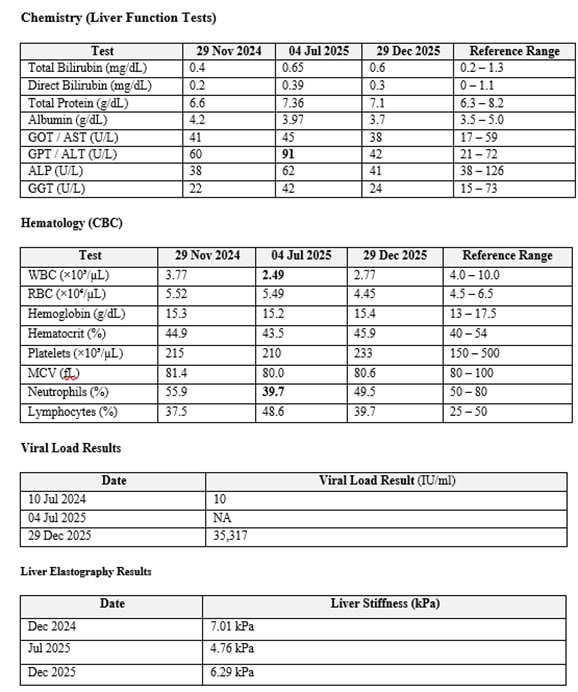 At the moment, I am not on medication. According to the physician managing my care, this is not yet the right time to start treatment. He explained that treatment decisions should be based on the overall clinical picture, including elastography results, platelet count, ALT levels, and other factors. He also mentioned that an increase in viral load alone is not sufficient to initiate medication.