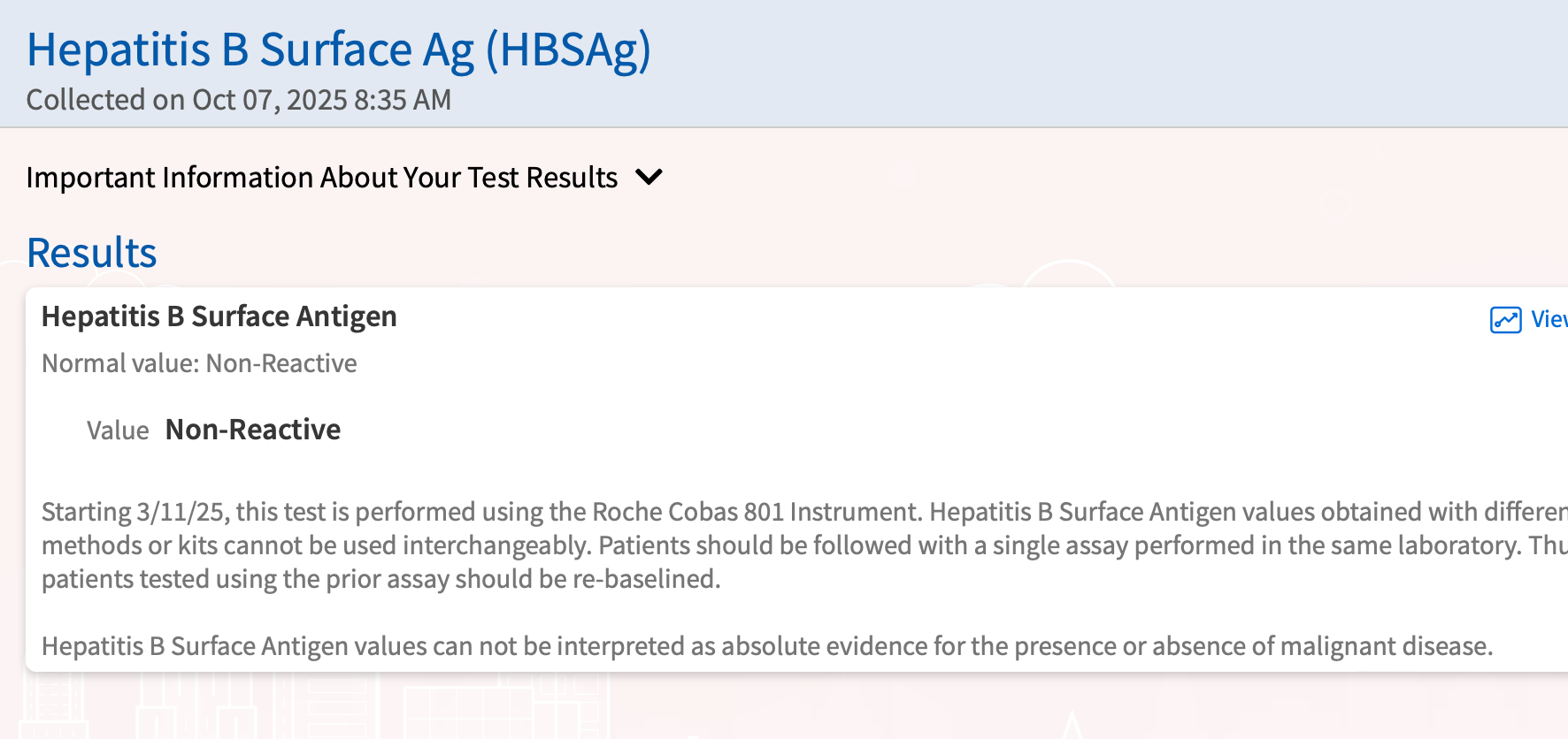 October 2025 Normal liver enzymes, HBV DNA undetectable, HBSag negative HBSab positive.