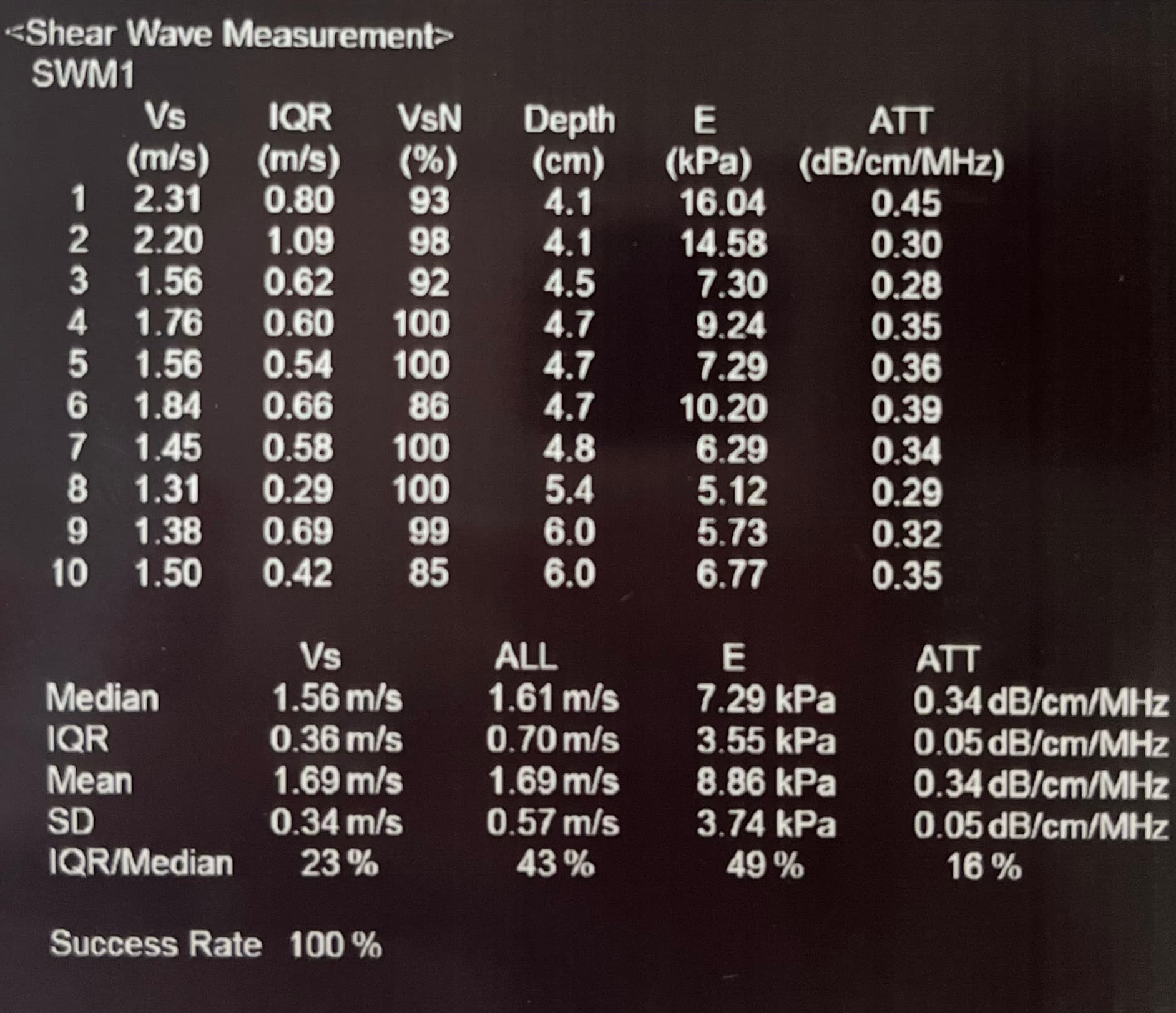 - First test (private clinic): 7.29 kPa (better result) but IQR/median = 49%, depth 4–6 cm - hepatologist said it was unreliable
