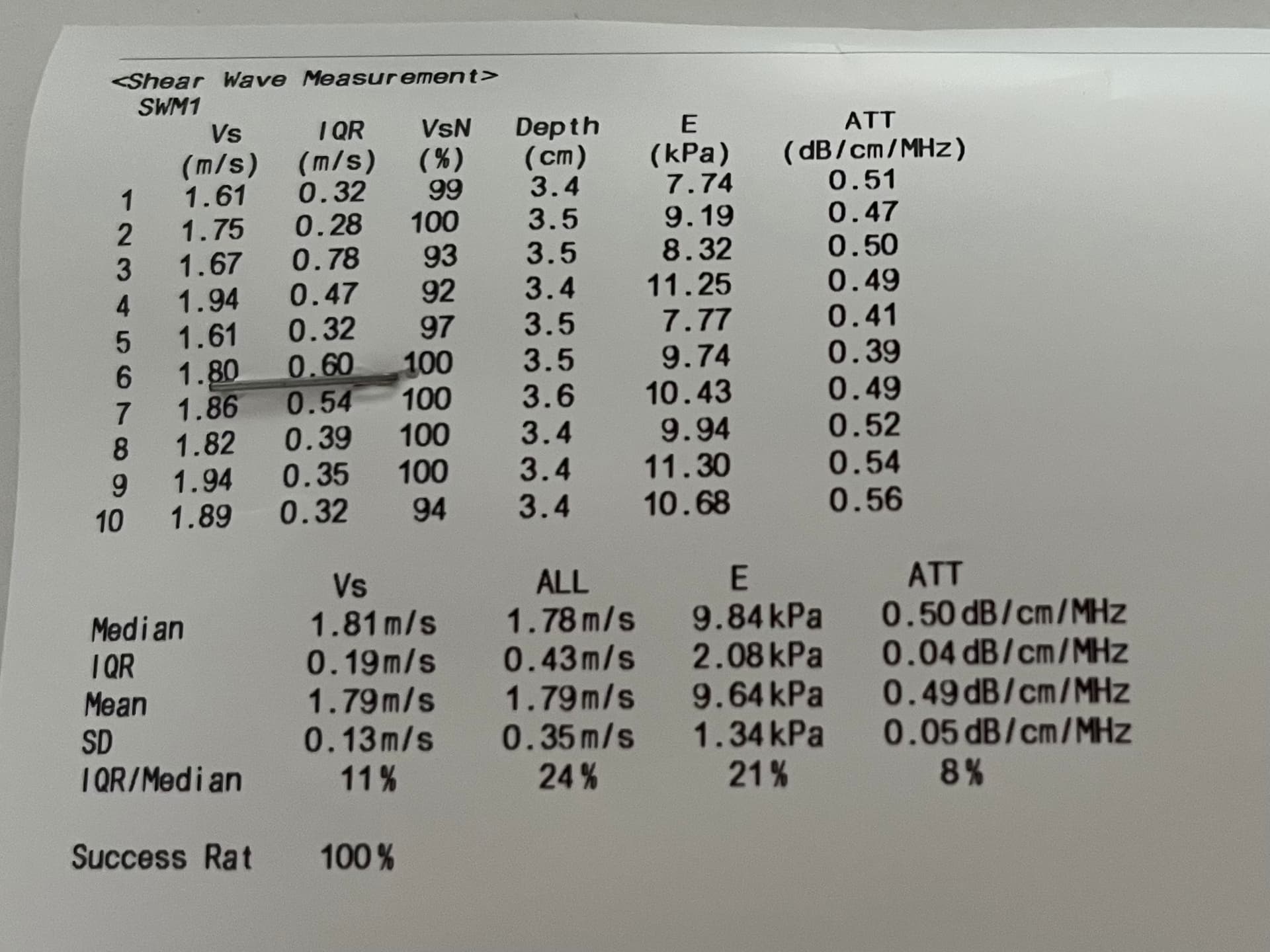- Second test (hospital center next to hepatology clinic): 9.84 kPa (F3 fibrosis), IQR/median = 21%, depth 3.5 cm - said to be more accurate